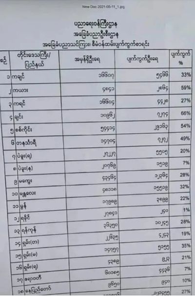 教育局发布的名单中,钦邦境内老师的缺勤率达到66%,是老师缺勤人数最多的一个省邦。克耶邦境内聘请的老师较少,但是参加CDM运动的老师占比却是第二多。据了解,克耶邦境内聘请了4841名老师,缺勤人数达到2864人,占59%。老师参加CDM运动最少的邦是若开邦,若开邦总聘请了27841名老师,仅有240名老师参加CDM运动,仅占1%。