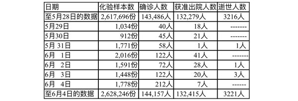 缅甸卫生暨体育部每天晚上8时都按时发出公告,介绍国内疫情发展的最新情况。由5月29日至6月4日每晚8时时所公布的情况分别如下: