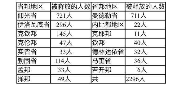 以上是官方报纸的报导。《十一新闻》的报导中则披露了各省邦被释放的人数,其中仰光省被释放的人数最多,为721人;曼德勒省次之,人数为711人;伊洛瓦底省位居第三,人数为296人。各省邦被释放的人数如下表: