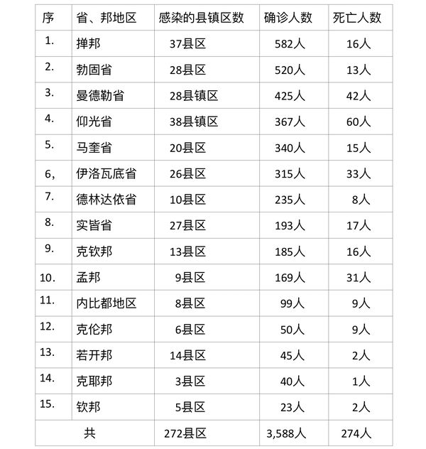 据缅甸卫生部8月7日下午7时所发布的公告,全国各省邦8月6日的确诊人数3588人,死亡人数274人,具体数据如下表: