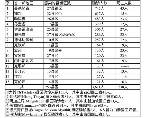 据缅甸卫生部8月10日下午4时所发布的公告,全国各省邦8月9日的确诊人数共为3611人,死亡人数238人,具体数据如下表: