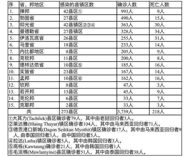 据缅甸卫生部8月12日下午5时所发布的公告,全国各省邦8月11日的确诊人数共为3739人,死亡人数218人,具体数据如下表: