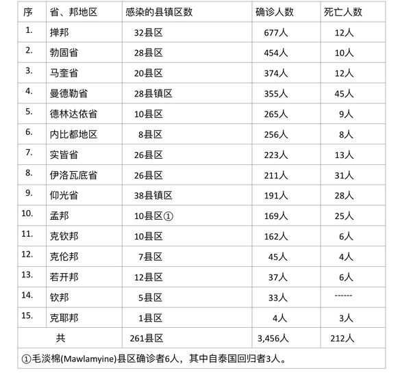 据缅甸卫生部8月14日下午5时所发布的公告,全国各省邦8月13日的确诊人数共为3456人,死亡人数212人,具体数据如下表: