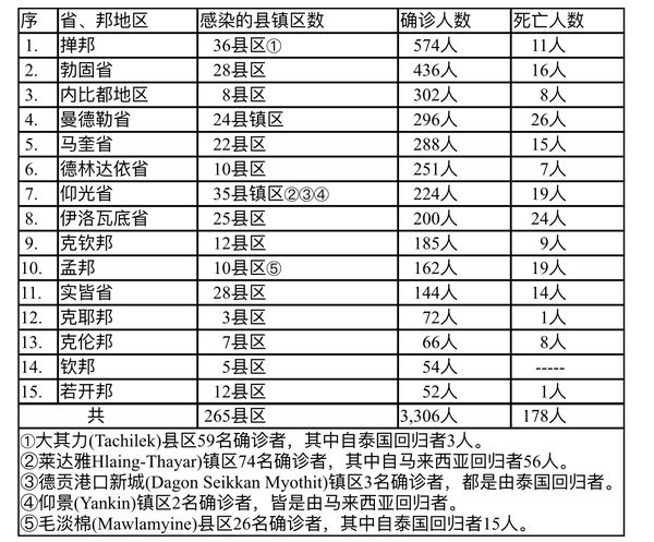 据缅甸卫生部8月18日下午5时所发布的公告,全国各省邦8月17日的确诊人数共为3306人,死亡人数178人,具体数据如下表: