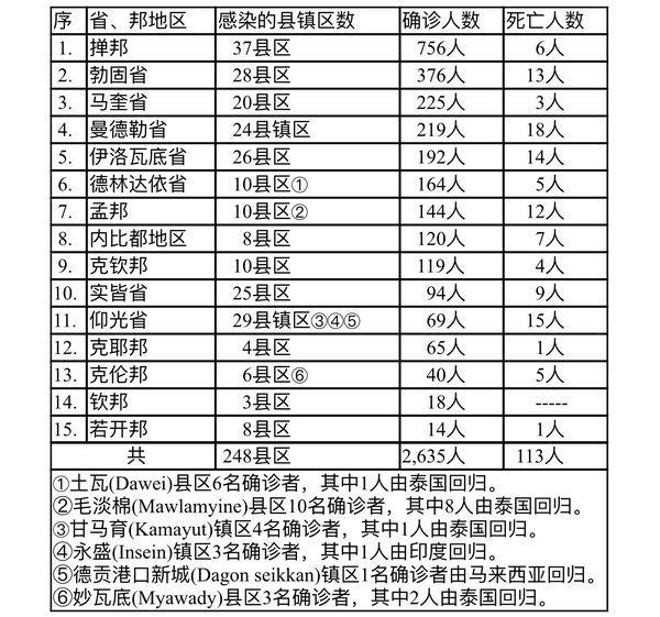据缅甸卫生部8月27日下午4时所发布的公告,全国各省邦8月26日的确诊人数共为2635人,死亡人数113人,具体数据如下表:
