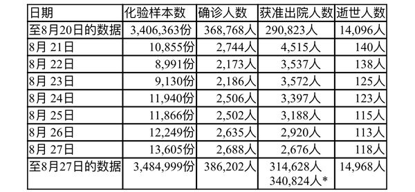 8月27日全国各地的化验室检测到的病患确诊者人数如下: