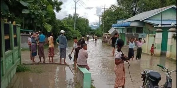 曼德勒省央米丁专区标贝镇,8 月 31 日的大雨恰逢大坝泄洪,迪彬村低洼房屋进水,两栋房屋已被冲走。