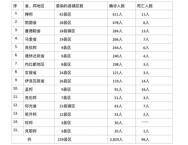 据缅甸卫生部9月6日下午4时所发布的公告,全国各省邦9月5日的确诊人数共为2829人,死亡人数96人,具体数据如下表:
