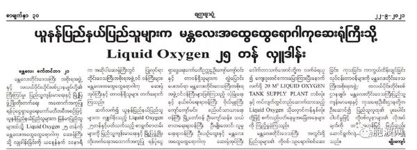 9月22日出版《耶德纳蓬日报》报道。9月21日曼德勒讯:“云南民众捐赠的液氧25吨再抵达曼德勒人民医院。”捐赠液氧转交仪式今天上午11时在曼德勒人民大医院举行。……