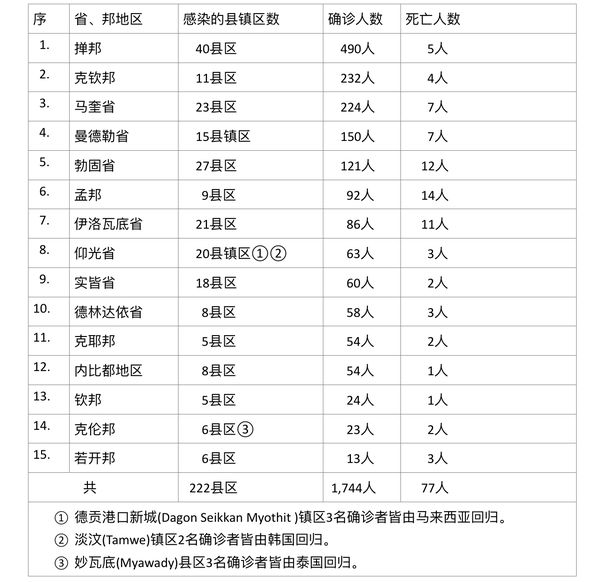 据缅甸卫生部9月24日下午4时所发布的公告,全国各省邦9月23日的确诊人数共为1744人,死亡人数77人,具体数据如下表: