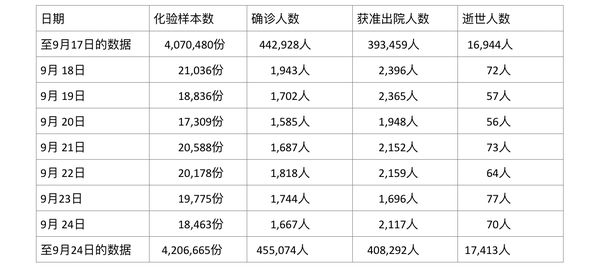 缅甸卫生部9月17日至9月24日每晚8时时所公布的疫情情况分别如下: