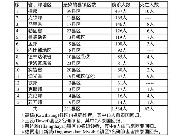 缅甸卫生部于9月27日下午4时发布的公告,全国各省邦9月26日的确诊人数共为1534人,死亡人数62人,具体数据如下表: