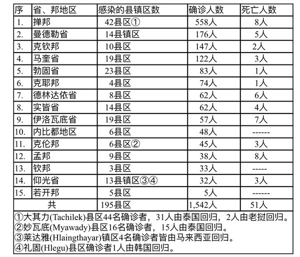 缅甸卫生部于9月30日下午4时发布的公告,全国各省邦9月29日的确诊人数共为1542人,死亡人数51人,具体数据如下表: