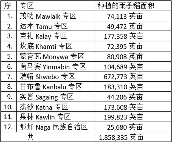 据10月3日出版的《 苗瓦底》日报报导,据悉今年雨季,实皆省的雨季种植工作已超额完成了原预定的种植计划。今年2020—21年实皆省原预定计划种植1,825,000英亩雨季稻,自2021年6月份开始有关种植工作,到9月30日时共种植了1,858,335英亩。各专区完成的雨季稻种植面积如下表: