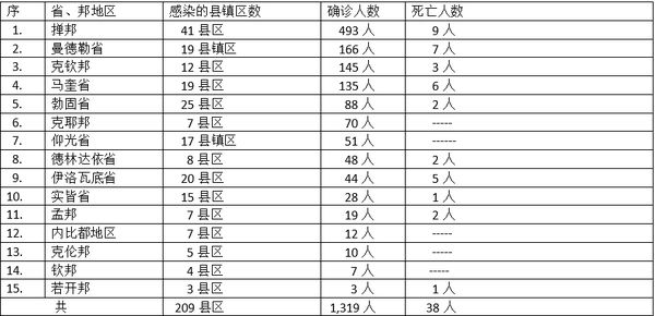 缅甸卫生部于10月5日下午4时发布的公告,全国各省邦10月4日的确诊人数共为1319人,死亡人数38人,具体数据如下表: