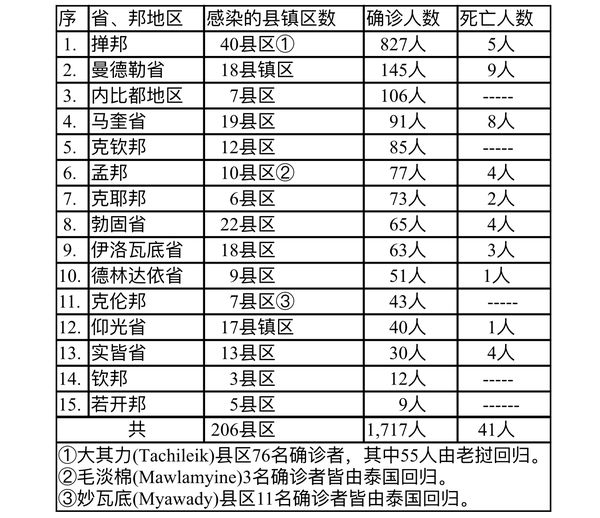 缅甸卫生部于10月7日下午4时发布的公告,全国各省邦10月6日的确诊人数共为1717人,死亡人数41人,具体数据如下表: