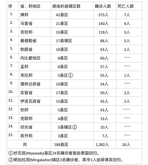 缅甸卫生部于10月13日下午4时发布的公告,全国各省邦10月12日的确诊人数共为1382人,死亡人数26人,具体数据如下表:
