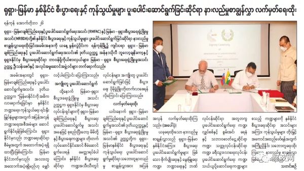 (一)《耶德纳蓬日报》报道。2021年10月26日仰光讯:“俄缅签署经贸合作备忘录。”俄缅友好协会(RMFAC)、缅俄经济发展协会(MRBDA)之间签署合作备忘录仪式今天下午于仰光举行。俄缅友协副主席MR.ANATOLY BULOCHNIKOV安娜兜里布罗羌郭为首的俄罗斯经济代表团与缅俄经济发展协会会长吴丹佐为首的理事会参加了活动。在大家的见证下双方签署了经贸合作备忘录(照片)。俄缅合作将包括多方领域:农业、畜牧业、金融与银行、电力能源、石油与天然气、矿物业、旅游业、交通等方方面面。看来,缅甸与俄罗斯的合作已势在必行!
