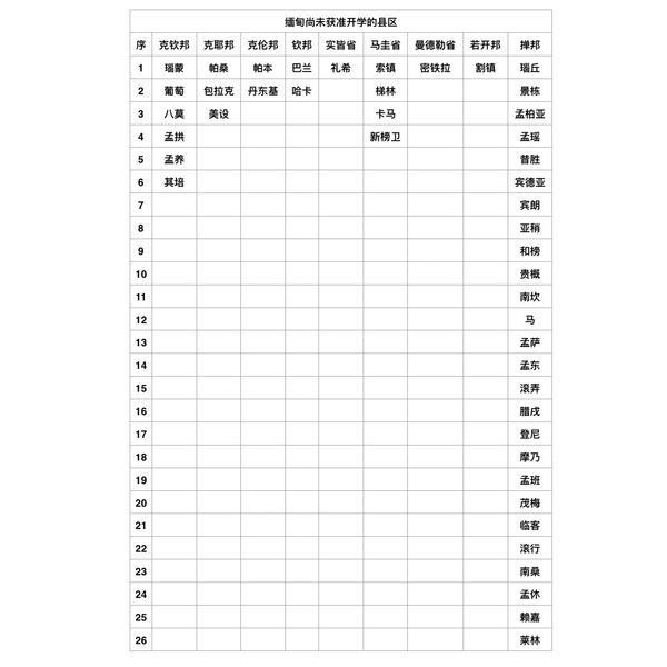 据缅甸中央新冠控制卫生委员发布的声明,尚未获准开学的县区如下表: