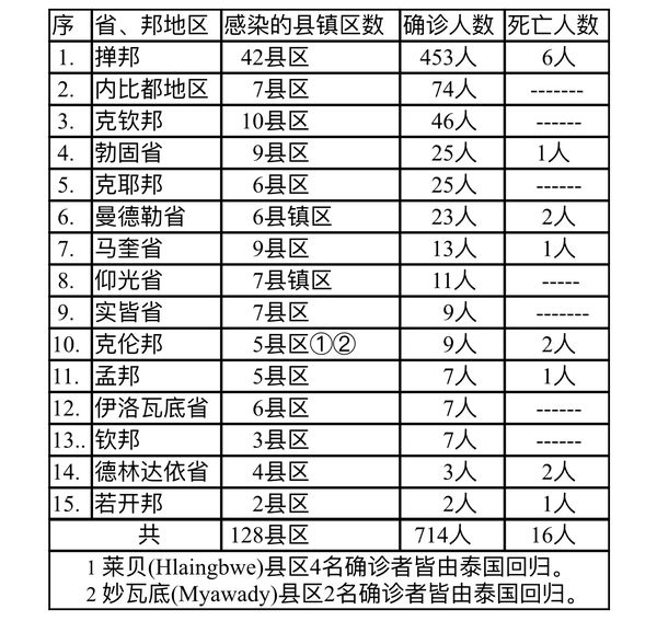 缅甸卫生部再于11月15日下午4时发布公告,全国各省邦11月14日的确诊人数共为714人,死亡人数16人,具体数据如下表: