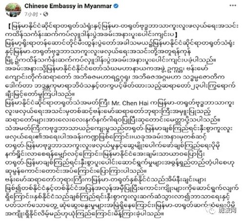 CHINESE EMBASSY IN MYANMAR中国驻缅甸大使馆网站报道(缅文):中国驻缅甸大使馆与缅中佛教交流协会联合举办缅甸传统“直桑岱点灯节格腾袈裟布施会”。缅甸僧侣协会主席(俗称僧王)八莫高僧亲临参加。……