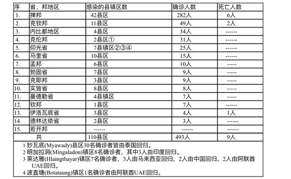 缅甸卫生部于11月27日下午4时发布公告,全国各省邦11月26日的确诊人数共为493人,死亡人数9人,具体数据如下表: