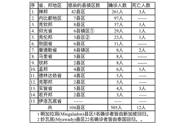 缅甸卫生部于11月28日下午4时发布公告,全国各省邦11月27日的确诊人数共为505人,死亡人数12人,具体数据如下表: