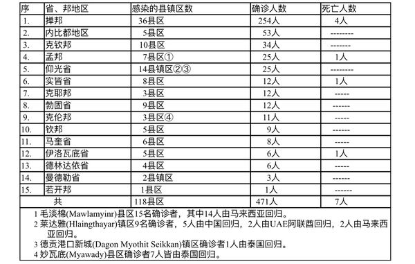 缅甸卫生部于12月1日下午4时发布公告,全国各省邦11月30日的确诊人数共为471人,死亡人数7人,具体数据如下表: