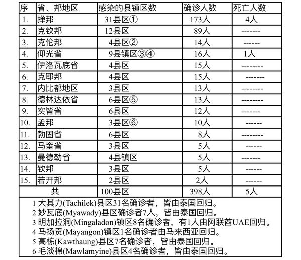 缅甸卫生部于12月9日下午4时发布公告,全国各省邦12月8日的确诊人数共为398人,死亡人数5人,具体数据如下表: