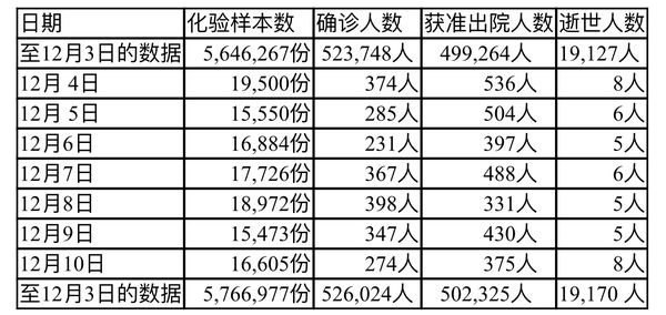 缅甸卫生部12月4日至12月10日每晚8时时所公布的疫情情况分别如下: