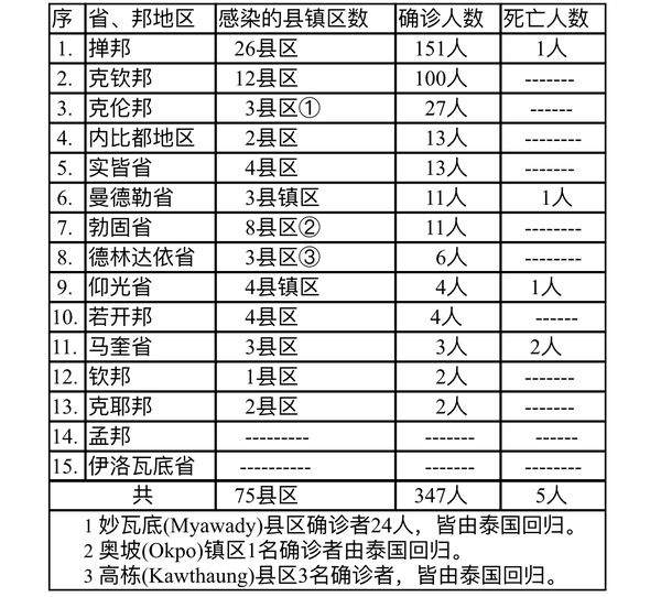 缅甸卫生部于12月10日下午4时发布公告,全国各省邦12月9日的确诊人数共为347人,死亡人数5人,具体数据如下表: