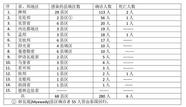 缅甸卫生部于12月13日下午4时发布公告,全国各省邦12月12日的确诊人数共为280人,死亡人数6人,具体数据如下表: