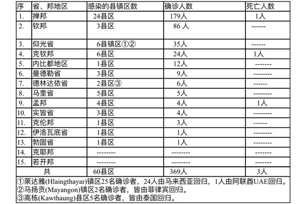 缅甸卫生部于12月31日下午4时发布公告,全国各省邦12月30日的确诊人数共为369人,死亡人数3人,具体数据如下表: