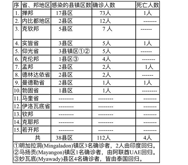 缅甸卫生部于1月2日下午4时发布公告,全国各省邦1月1日的确诊人数共为112人,死亡人数4人,具体数据如下表: