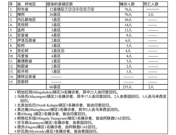 缅甸卫生部于1月12日下午4时发布公告,全国各省邦1月10日的确诊人数共为235人,死亡人数2人,具体数据如下表: