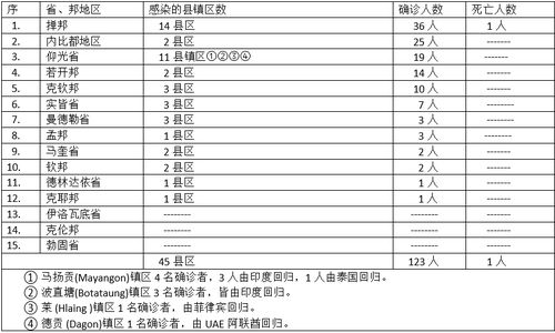 缅甸卫生部于1月17日下午4时发布公告,全国各省邦1月16日的确诊人数共为123人,死亡人数1人,具体数据如下表:
