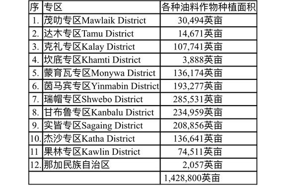2021—22财政年度实皆省计划在11个专区及那加(Naga)民族自治区所属的各县区内共种植油料作物1,521,456英亩(见《缅华网》2021年10月28日“缅甸新闻”栏目中的有关报导),而在2020—21财政年度冬季作物种植季节中,油料作物种植面积达到1,628,266英亩。