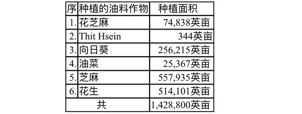 种植的油料作物有花芝麻、向日葵、油菜、芝麻、花生等,另外还有缅语称为Thit Hsein的一种作物,各种作物完成的种植面积如下表: