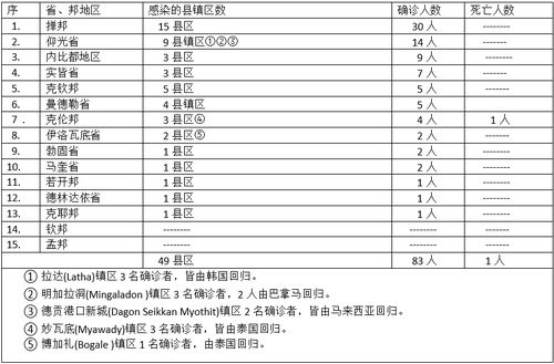 缅甸卫生部于1月22日下午4时发布公告,全国各省邦1月21日的确诊人数共为83人,死亡人数1人,具体数据如下表: