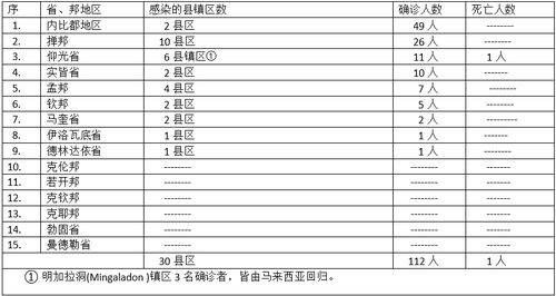 缅甸卫生部于1月24日下午4时发布公告,全国各省邦1月23日的确诊人数共为112人,死亡人数1人,具体数据如下表: