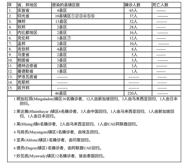 缅甸卫生部于1月26日下午4时发布公告,全国各省邦1月25日的确诊人数共为220人,无死亡人数,具体数据如下表: