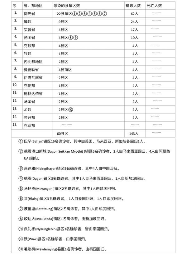 缅甸卫生部于2月3日下午4时发布公告,全国各省邦2月2日的确诊人数共为143人,无死亡人数,具体数据如下表: