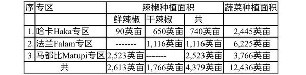 各专区在本财政年度种植的辣椒及蔬菜面积如下:
