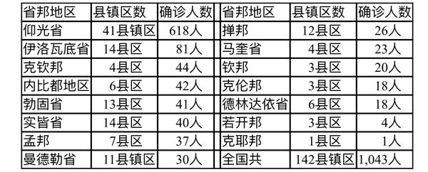 缅甸卫生部于2月10日下午5时发布公告,全国各省邦2月9日的确诊人数共为1043人,无死亡人数,具体数据如下表: