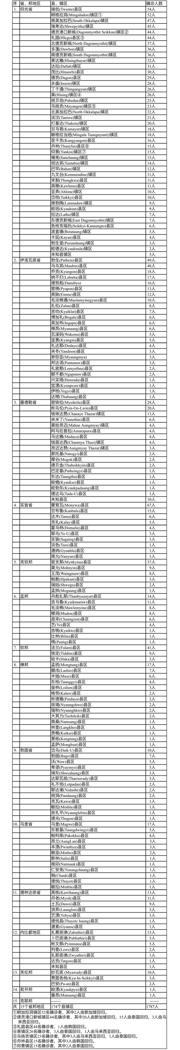 缅甸卫生部于2月13日下午5时发布公告,全国各省邦2月12日的确诊人数共为1787人,无死亡人数,具体数据如下表: