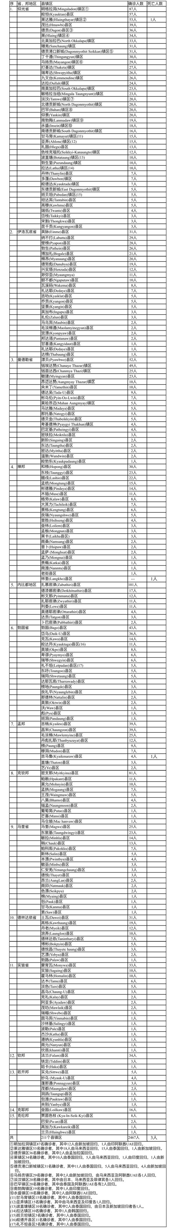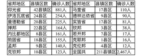 缅甸卫生部于2月16日下午7时发布公告,全国各省邦2月15日的确诊人数共为2467人,死亡人数3人,具体数据如下表: