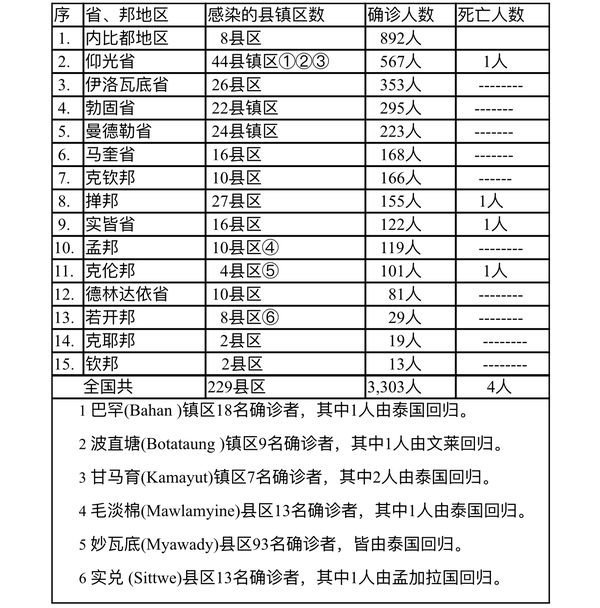 缅甸卫生部于2月21日下午6时发布公告,全国各省邦2月20日的确诊人数共为3,303人,死亡人数4人,具体数据如下表: