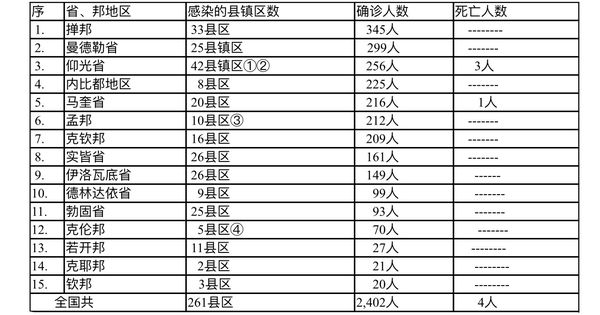 全国15个省、邦地区都有众多的确诊人数,其中有11个省邦地区确诊人数在百人以上或接近百人,可见疫情蔓延的严重性。单日死亡人数也达到4人,分别为来自仰光省3人及马奎省1人,仰光省3人为南奥加拉巴镇区、丹林县区及皎坦县区各1人,马奎省1人来自斯林(Salin)县区。