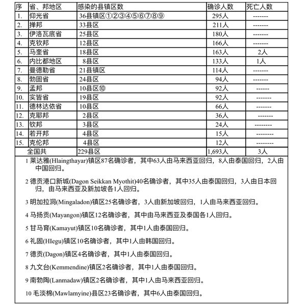 全国15个省、邦地区都有众多的确诊人数,其中有10个省邦地区确诊人数在百人以上或接近百人,可见疫情蔓延的严重性。单日死亡人数也达到3人,分别为来自马奎省2人及内比都1人,马奎省2人为敏拉(Minhla)县区及东敦基县区各1人,内比都1人为来自达贡县区1人。