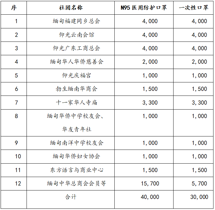 2、仰光云南会馆,4000个N95 医用防护口罩,4000个一次性口罩,由仰光云南会馆代表领取;